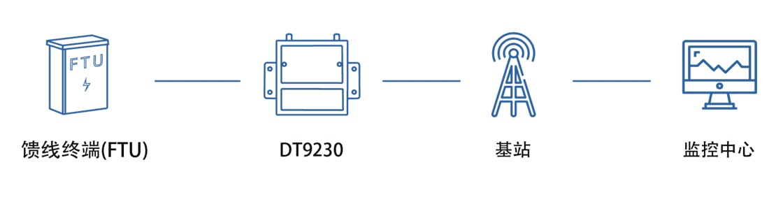 借助運營商網絡監控FTU裝置,實現遙測、遙信、遙調及故障監測,用DT9230與配電自動化主站通信,提供開關狀態、電能參數及各類故障信息,